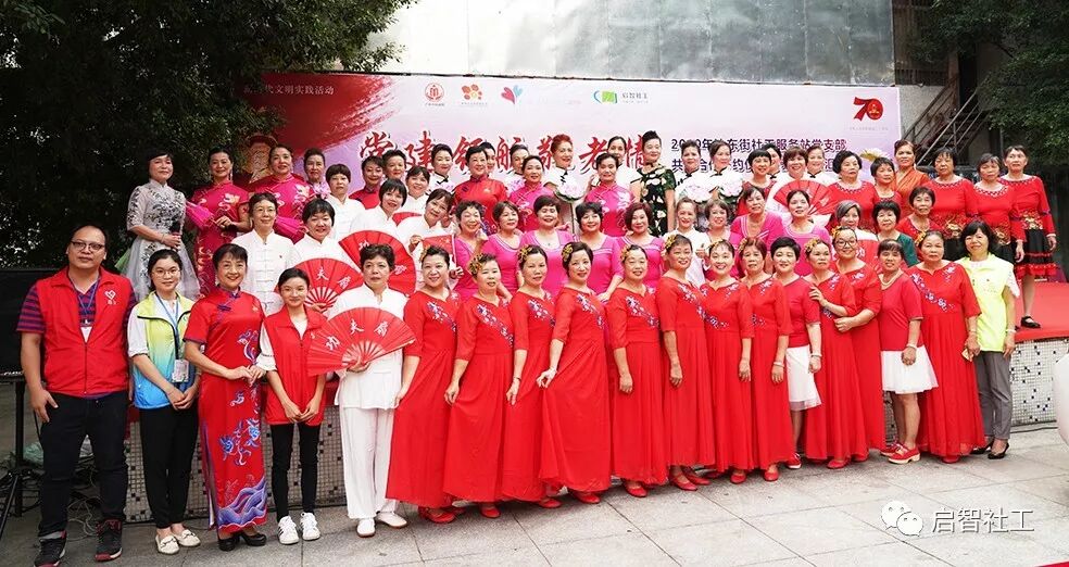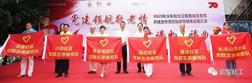 为庆祝中华人民共和国成立70周年,并结合敬老主题月,2019年10月23日上午,在沙东街道党工委、办事处的指导下,沙东街社工服务站党支部、沙东街社工服务站在沙东街双拥文化广场举办“党建领航敬老情,共建谱出幸福曲”——2019年沙东街社工服务站党支部共建合作签约仪式暨敬老主题汇演活动,沙东街道党工委书记杨演锋、沙东街道党工委副书记王民、沙东街道办事处副主任陈燕文、沙东街道办事处民政科科长李育郴、中共广东省委委员、广东省党代表、广州市天河区启智社会工作服务中心党支部书记李森、各基层党支部书记或代表、党员群众共200多人出席参与活动。本次活动得到了广州市第六届公益创投项目“共建共治共享——社区党员志愿队伍培育计划”的大力支持。